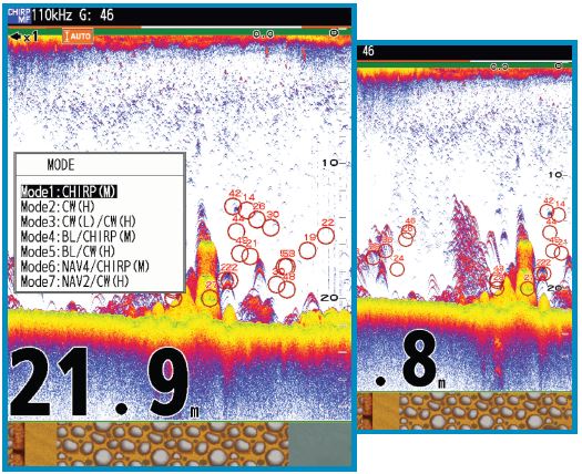Bottom Discrimination - Provides recognition of bottom composition with 4 types of graphic displays (Rock/Sand/Gravel/Mud)