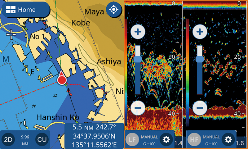 L’interfaccia grafica utente dei chart plotter GP1871F/1971F è molto semplice e intuitiva ed è basata sulla serie Furuno Navnet TZT2. Le modalità operative sono perfettamente personalizzabili con tre finestre e 5 tipi delle schermate: Plotter cartografico, Ecoscandaglio, Radar, Dati di navigazione e Autopilota. La funzione “Edge-Swipe” garantisce all’utente un facile accesso ai Menù laterali a scomparsa attivabili dai quattro bordi dello schermo.